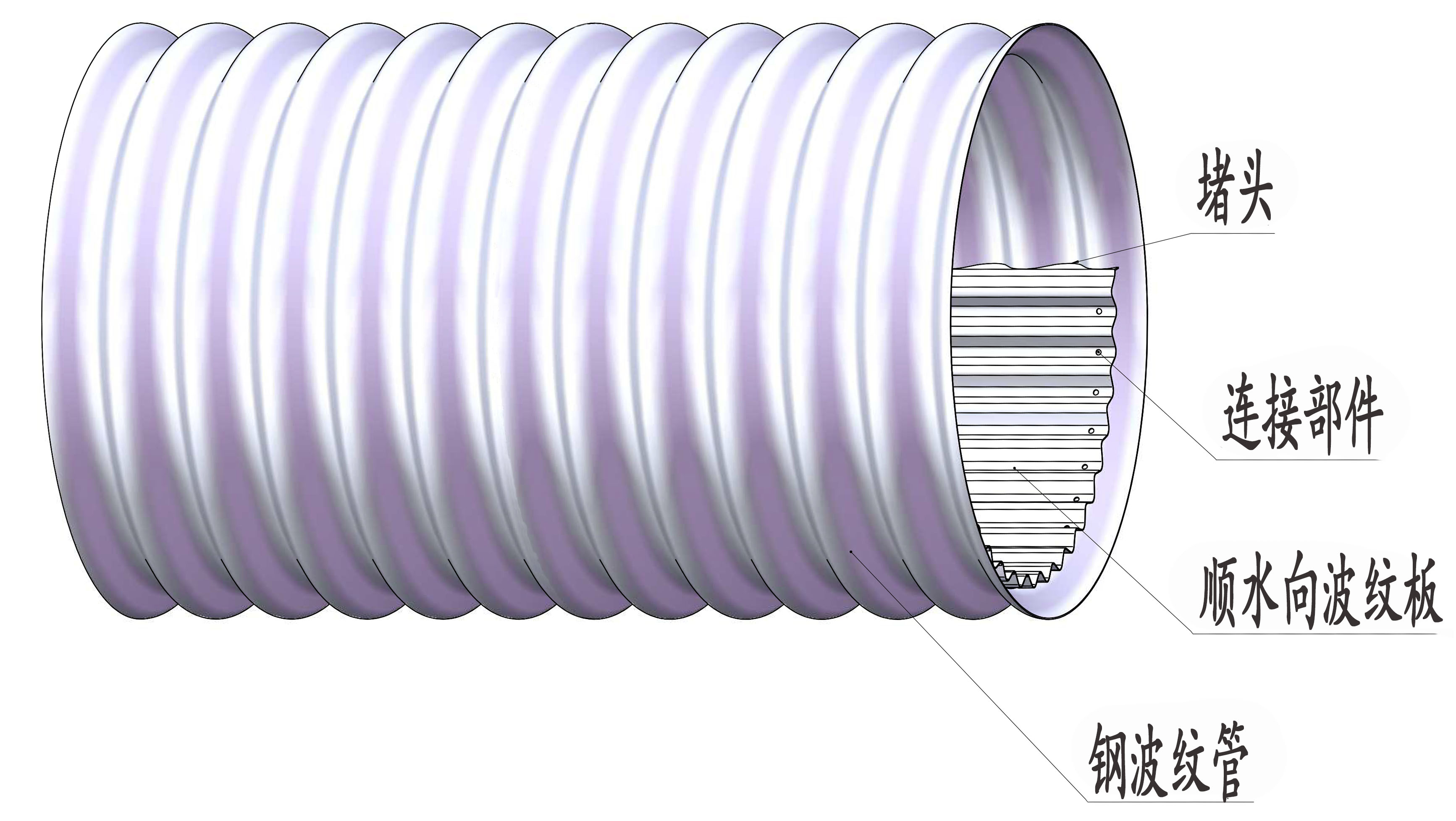以鋼波紋管作為主體,在鋼波紋管內設置順水波紋板用連接部件連接,順水波紋板的波峰波谷順著鋼波紋管的長度方向,避免了水流中的砂石、雜質等物體對鋼波紋管內壁環(huán)形波紋的沖刷和損壞。