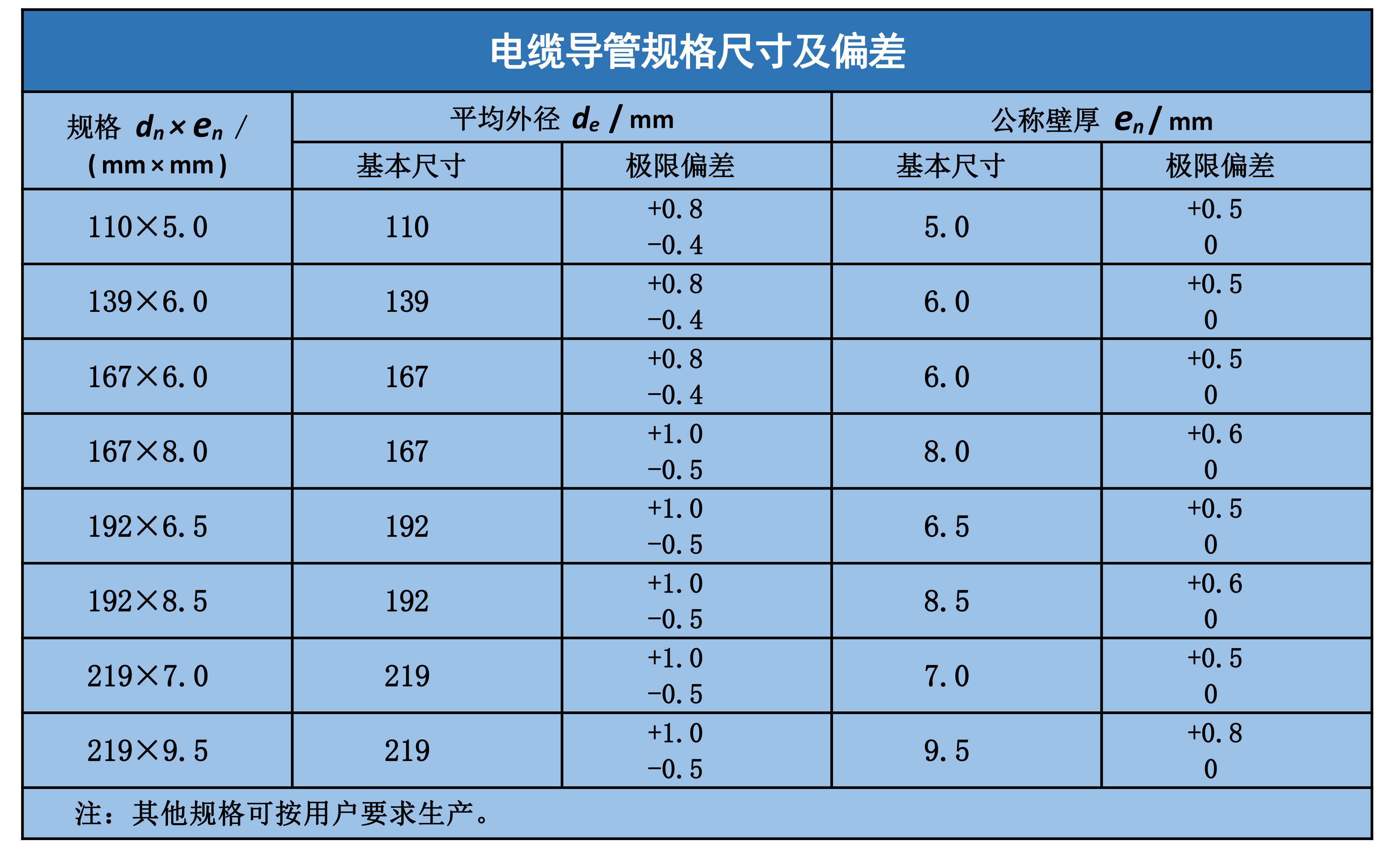 的溫度78°C有了很大提高。用于埋地電力電纜保護(hù)管,即使管內(nèi)電纜發(fā)生過(guò)載或短路,所產(chǎn)生的溫度對(duì)產(chǎn)品無(wú)任何影響, 經(jīng)模擬實(shí)驗(yàn),電纜芯線溫度連續(xù)15天為100°C時(shí),埋地管壁溫度為80°C ,處于熱平衡狀態(tài),不發(fā)生變形。