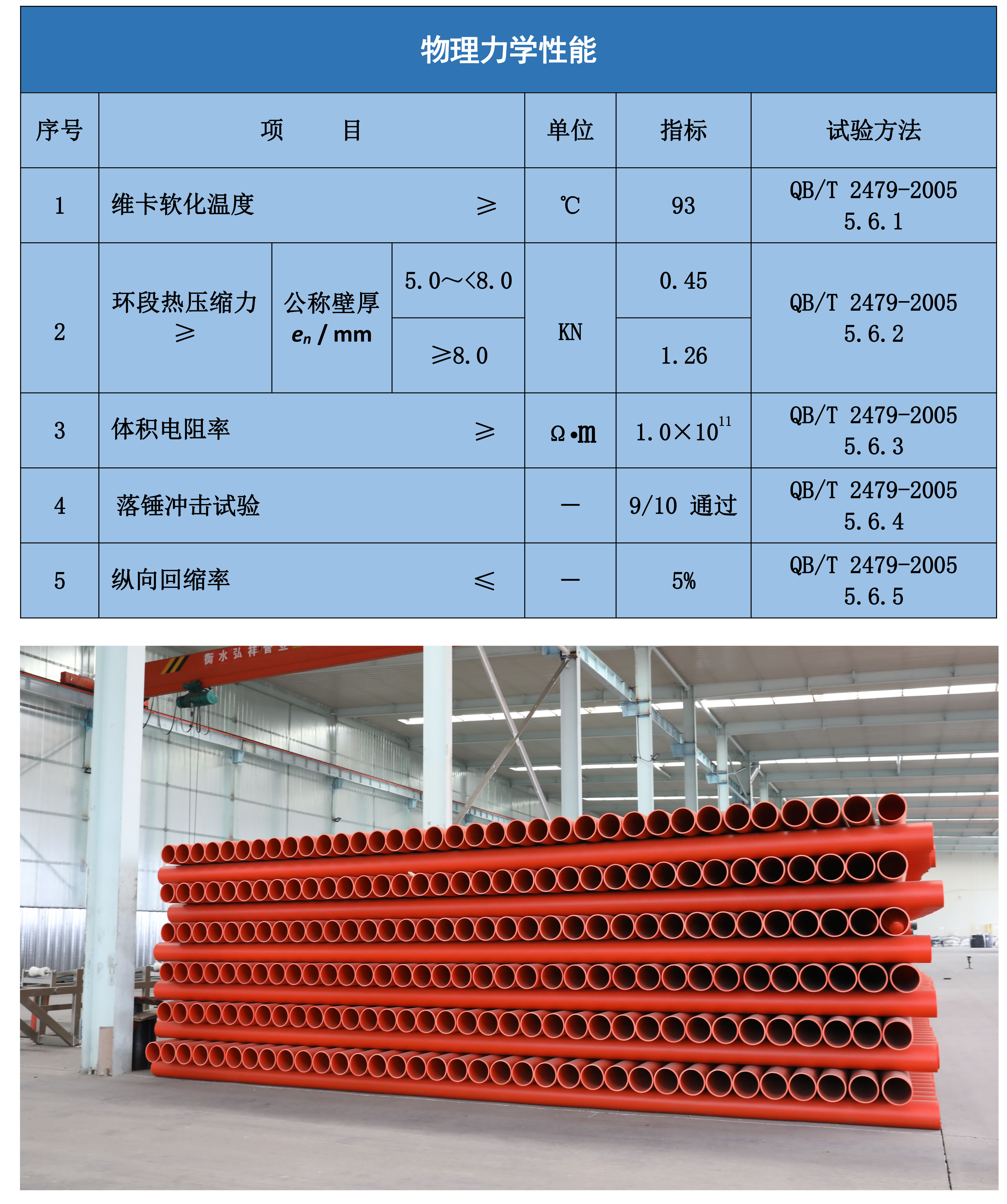 pvc電纜保護(hù)管用氯化聚乙烯管材,主要用于電力電纜敷設(shè)并起導(dǎo)向和保護(hù)電力電纜作用,產(chǎn)品采用擴(kuò)口承插,連接處采用耐高溫橡膠圈密封,可以防止熱脹冷縮的影響。施工中一般情況下無(wú)需在施工現(xiàn)場(chǎng)澆搗混凝土及保障層,自重輕、施工方便、運(yùn)輸及施工費(fèi)用低,土方開(kāi)挖量小,可以大大縮短工期,特別是該產(chǎn)品經(jīng)過(guò)改性后,其“維卡軟化點(diǎn)”溫度可提高到93°C以上,比普通PVC-U管材維卡軟化點(diǎn)